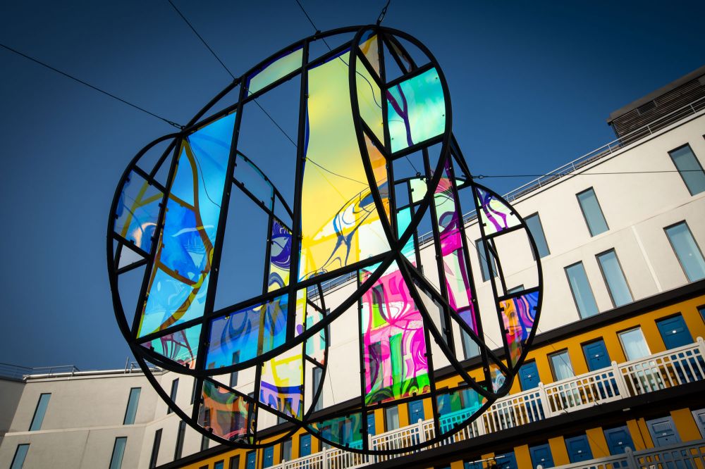 L’année suivante c’est l’artiste Amélie Lengrand qui installe une structure immense au dessus du bassin. Elle reprend la forme du logo iconique avec des facettes colorées diffractant la lumière naturelle pour rappeler les vitraux de Molitor.